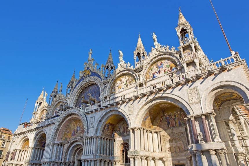 Standing in front of the 11th century basilica, home to the relics brought back by Saint Mark from Alexandria in 828 , you almost feel like you're in a scene from 'One Thousand and One Nights'. The five domes, the gold and marble facades already evoke the splendors of the East ... which is then enhanced by the 4,000 m2 of interior gold-coloured mosaics (11th-14th century) which depict a gigantic illustrated bible.