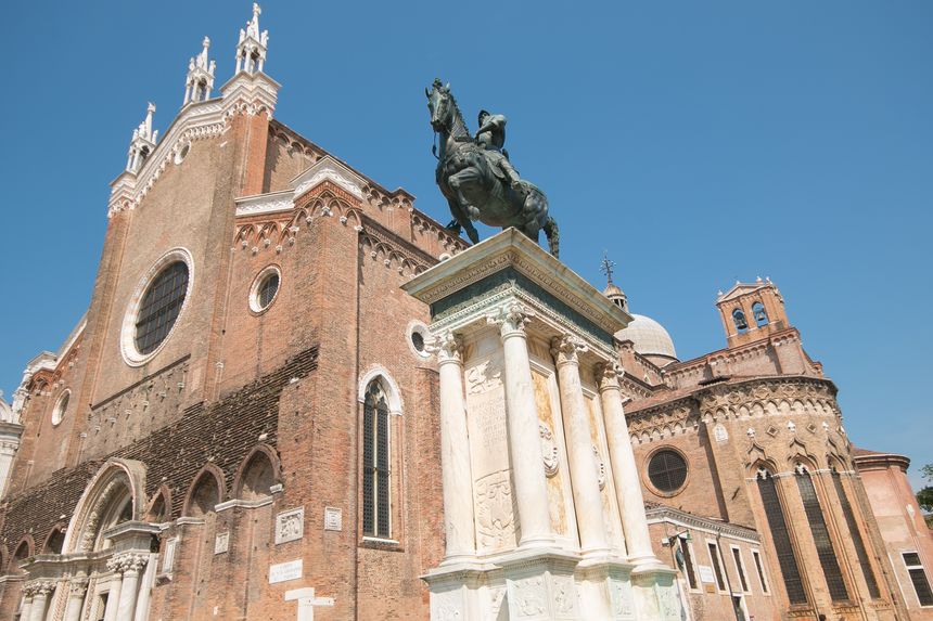The mendicant orders left behind two great Gothic sanctuaries in Venice: the Frari, in the San Polo district, a Franciscan sanctuary, and Santi Giovanni Paolo, in the Castello area, built by thirteenth and fifteenth-century Dominicans. They certainly try to outdo each other in terms of size and artistic richness, both assuming the title of the "Pantheon" of Venice. Behind it's large and somewhat plain façade, made from pink bricks hemmed with white, it opens onto a huge basilica more than 100 m long and 32 m high.. Santi Giovanni e Paolo (or San Zanipolo in Venetian dialect) is home to at least 25 doge tombs, as well as Venetian monuments from some of the greatest statue grand masters, such as the Tommaso Mocenigo and Sebastiano Venier monuments.