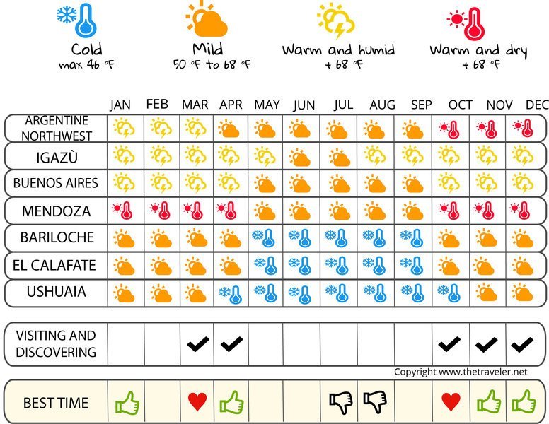 Bariloche | Buenos Aires | Cachi | Córdoba | Departamento de Humahuaca | Departamento de Iruya | El Calafate | Iguaçu | Iguazú Falls | Mendoza | Puerto Iguazú | Purmamarca | Salta | San Martín de los Andes | Santiago del Estero | Senador Pérez | Tilcara | Ushuaia |The weather month by month in Argentina