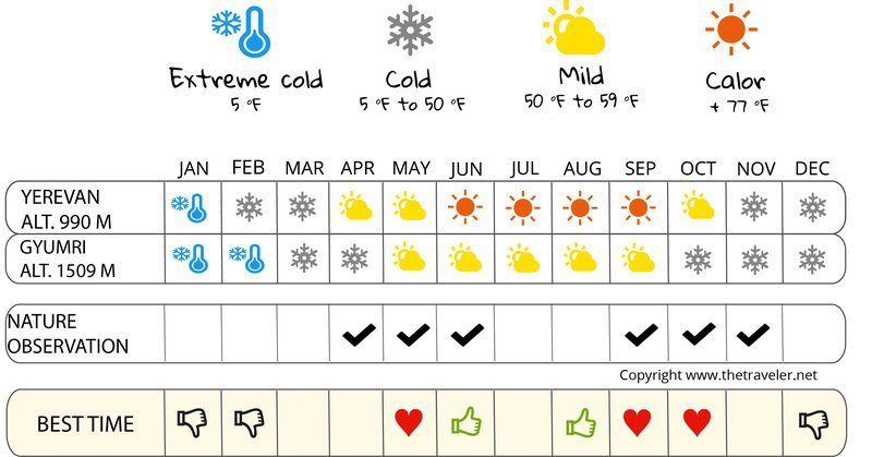 The climate in Armenia is continental and is often very dry. The country offers vastly differing temperatures from one season to another. Thus, take advantage of the shoulder seasons to enjoy the country from the end of April to mid-June and mid-September to mid-October, meaning you’ll avoid the rain, scorching heat, or conversely, the cold, wintery nights.