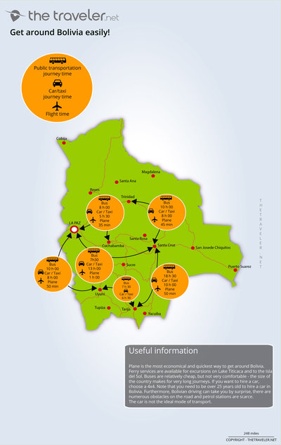 Direct flights are available from the UK, and a return flight to discover Bolivia's delights will set you back from £800. There are several airports in the Bolivia, allowing swift travel around the country. Buses are cheaper but slower. Comfort is minimal, but savings can be made. If you are over 25 years old, cars can be hired in most cities. Be warned that Bolivian driving can be somewhat surprising, and petrol stations are few and far between.