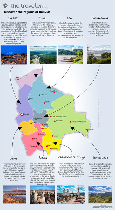 Discovering Bolivia could begin with a visit to, La paz, the administrative capital where modern architecture coexists with centuries old monuments: colonial churches (such as the San Francisco Cathedral), the art museum, Plaza Murillo and the surprising Mirador Killi Killi are all unmissable sights. Your days in La Paz and the surrounding area will be filled with memories. Then head out for an excursion to Lake Titicaca and the Isla del Sol before hiking through one of the southern national parks. Strolling through the streets of Tarija, Potosi and Villa de Cochabamba is like stepping back in time to the colonial era. And don't miss the breathtaking scenery of Salar de Uyuni, the largest salt flats in the world or the northern parks and reserves in the heart of the Amazon.