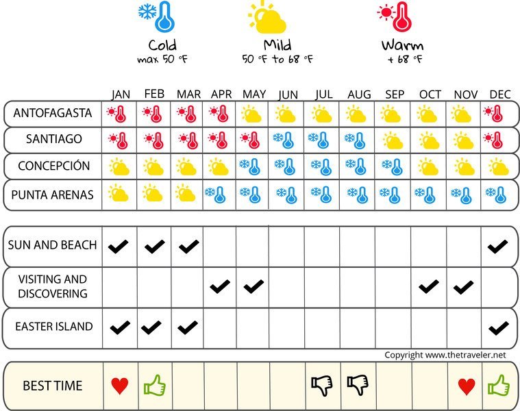 Ancud | Antofagasta | Arica | Bahía Inglesa | Calama | Castro | Copiapó | Easter Island | Hanga Roa | Iquique | La Serena | Pucón | Puerto Natales | Puerto Varas | Pular | Santiago | Valdivia | Valparaíso | Viña del Mar |The weather month by month in Chile