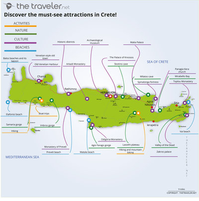 Crete is an island filled with places to visit. From magnificent historic villages to glorious archaeological sites and the breathtaking countryside of mountains and sea. Among the essential places to visit are the Temple of Knossos, the most visited archaeological site on the island, the monasteries of Arkadi, Toplou and Preveli, and the wonderful towns of Chania and Rethymnon with their steeples and minarets. Do you want idyllic beaches? Crete has them the length of its coast. Elafanossi with its swathe of fine sand shouldn’t be missed and nor should the Balos Lagoon with its turquoise water. Discover Crete's most beautiful beaches with our map. Crete is a paradise for the sporting, especially hikers who can enjoy the many trails around the island. The Samaria Gorge, known throughout Europe, promises an unforgettable and spectacular 10 mile walk. Its narrowest point is less than 3 metres wide and is known as the “Iron Gate.” Aradena, Karanou and Irini gorges are smaller but lesser known and wilder. We have created an activity map for what to do in Crete .