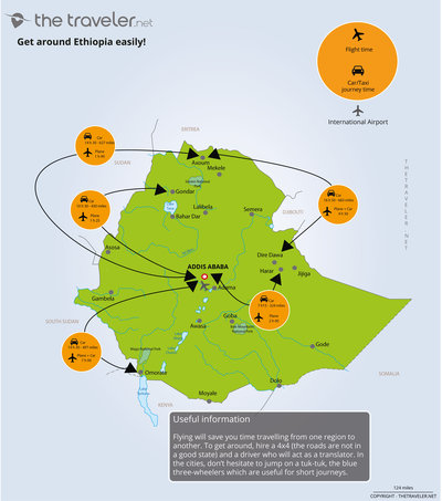 Given the distances between cities, flying will save you time. The national Ethiopian Airlines has a good reputation. Prices are reasonable, with return flights costing around 100 dollars. It is worth knowing that flights are cheaper if booked with a local travel agency.