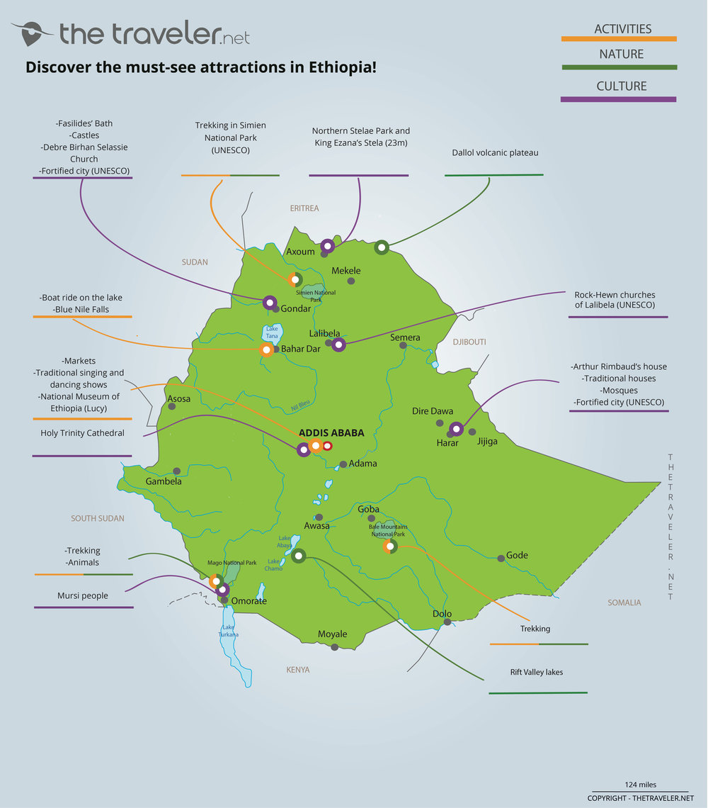 Éthiopia is without any doubt one of the jewels of the African continent. As interesting as it is magnificent, the country is replete with treasures that delight every visitor. A visit to the capital, Addis Ababa, is a must. The northern region is home to the majority of the country's tourist attractions, including the cities of Lalibela and Gondar as well as the Simien National Park. Equally, don't miss the east of the country where Harar, the country's most beautiful city can be found. In the very south is the pleasant city of Awasa. Exploring the Rift Valley, with its great lakes, national parks, numerous species of wildlife is equally indispensable.