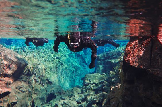 Iceland is an island in continuous movement, situated on the convergence of two oceanic plates, the Eurasian and North-American plates. They are diverging by about two centimetres per year and the dividing point is the Silfra fault, located in the heart of Thingvellir National Park. It is one of the most extraordinary cold water diving sites in the world, with crystal clear water allowing visibility up to 100 meters deep! The exceptional purity of the icy water captures natural light like crystal. You can choose between snorkelling or diving, if you have the minimum skills required. Once below the surface, there is a series of pools leading to the “Silfra Cathedral”, the deepest section of the canyon, where you can even touch the two plates at the same time!