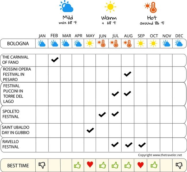 In July, in Bologna, Minimum temperatures vary between 19 in the morning and 31 in the afternoon. Températures are really hot. The average rainfall is around 35 inches, for 27 days without rain.