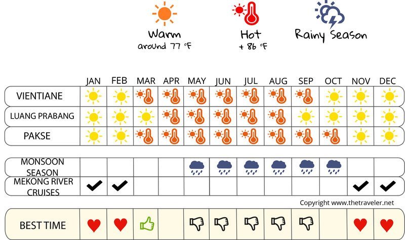 Laos is subject to a tropical climate which is influenced by the monsoon. Between the months of April and October, it is the rain season. It is hot during this time, with temperatures being able to reach 86°F in the month of May. At this time of year, rain is very frequent in the south of the country. By contrast, in Vientiane, the weather is drier, and it generally only rains in the evenings. As for the dry season, this stretches from November to March. Temperatures are moderate and milder than during the rain season. If you are thinking of heading into the mountains, it is strongly recommended to take warm clothing with you.
