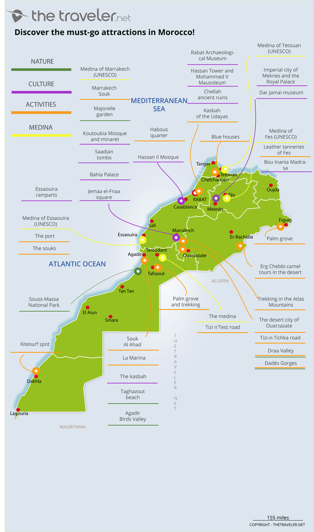 Discover Morocco as you have never seen it before! I propose 3 tourist maps for your trip in Morocco Don't miss any of the must-see places in Rabat, Casablanca or Marrakesh, and organise your trip thanks to the travel map.