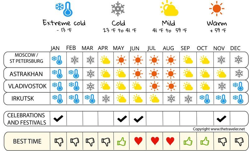 Russia's continental climate is characterised by short, warm summers and cold winters that lengthen as one travels east or to the north. In February, for example, if it is 46°F in St. Petersburg, it will be 80°F in western Siberia and as low as 109°F in Yakutsk in eastern Siberia. To visit the largest country on the planet, the period from June to September is ideal. It is better to avoid the spring for a trip to Russia because the slush generated by the melting snow makes it difficult to move around