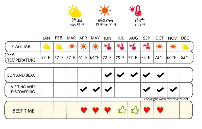 In August, in Cagliari, Minimum temperatures vary between 21 in the morning and 32 in the afternoon. Températures are really hot. The average rainfall is around 7 inches, for 30 days without rain.