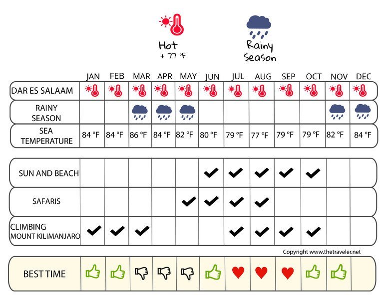 Tanzania has a tropical climate throughout the year, but with significant regional variations. Overall, it has two seasons, a dry season from June to October (maximum temperatures around 84°F in Dar es Salaam), and a rainy season that varies in duration depending on the region.